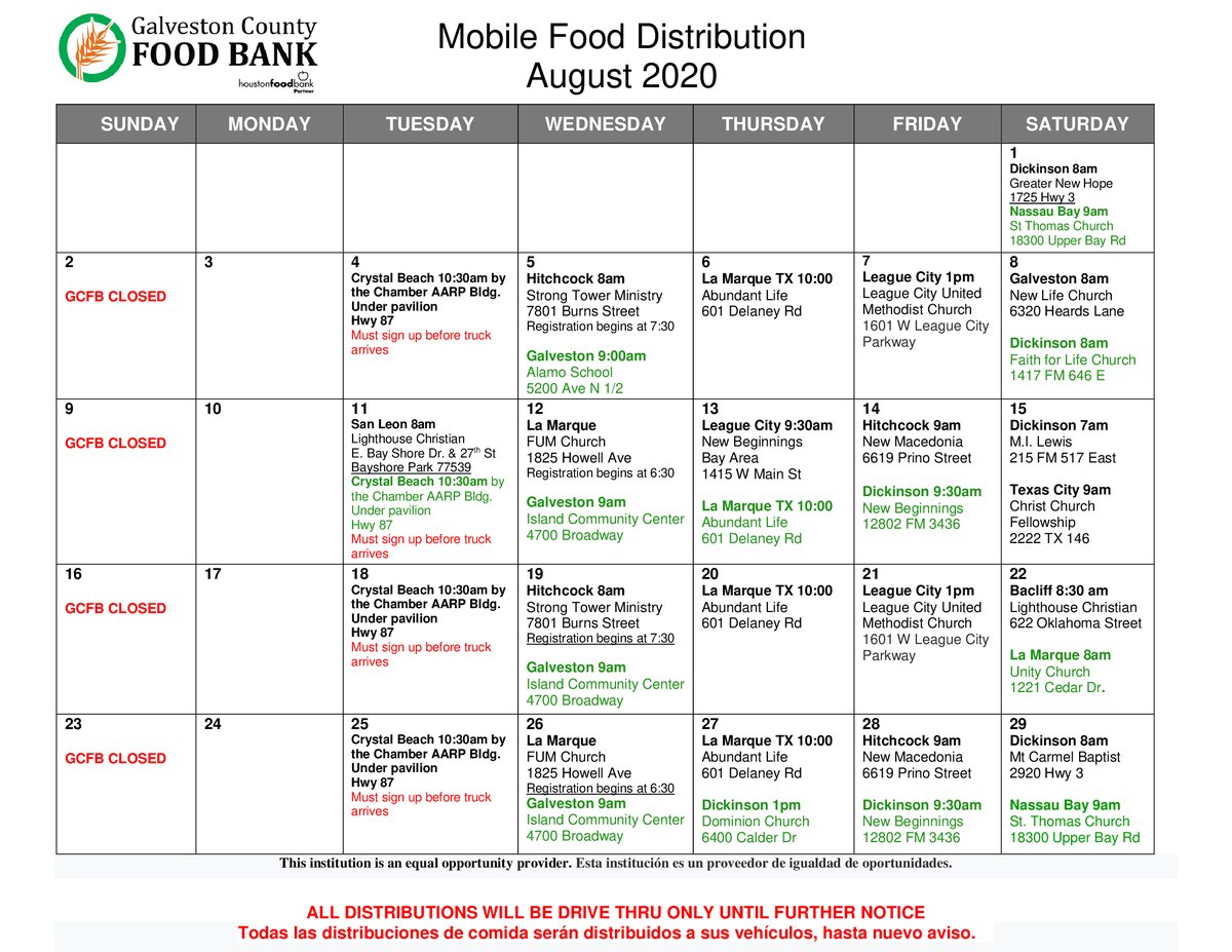 Galveston County Meals Financial institution Right here Is Our Most Up To Date Cellular Meals Distribution Calendar Please Notice Some Areas Have Canceled And There Are Additionally A Few New Areas Any Resident