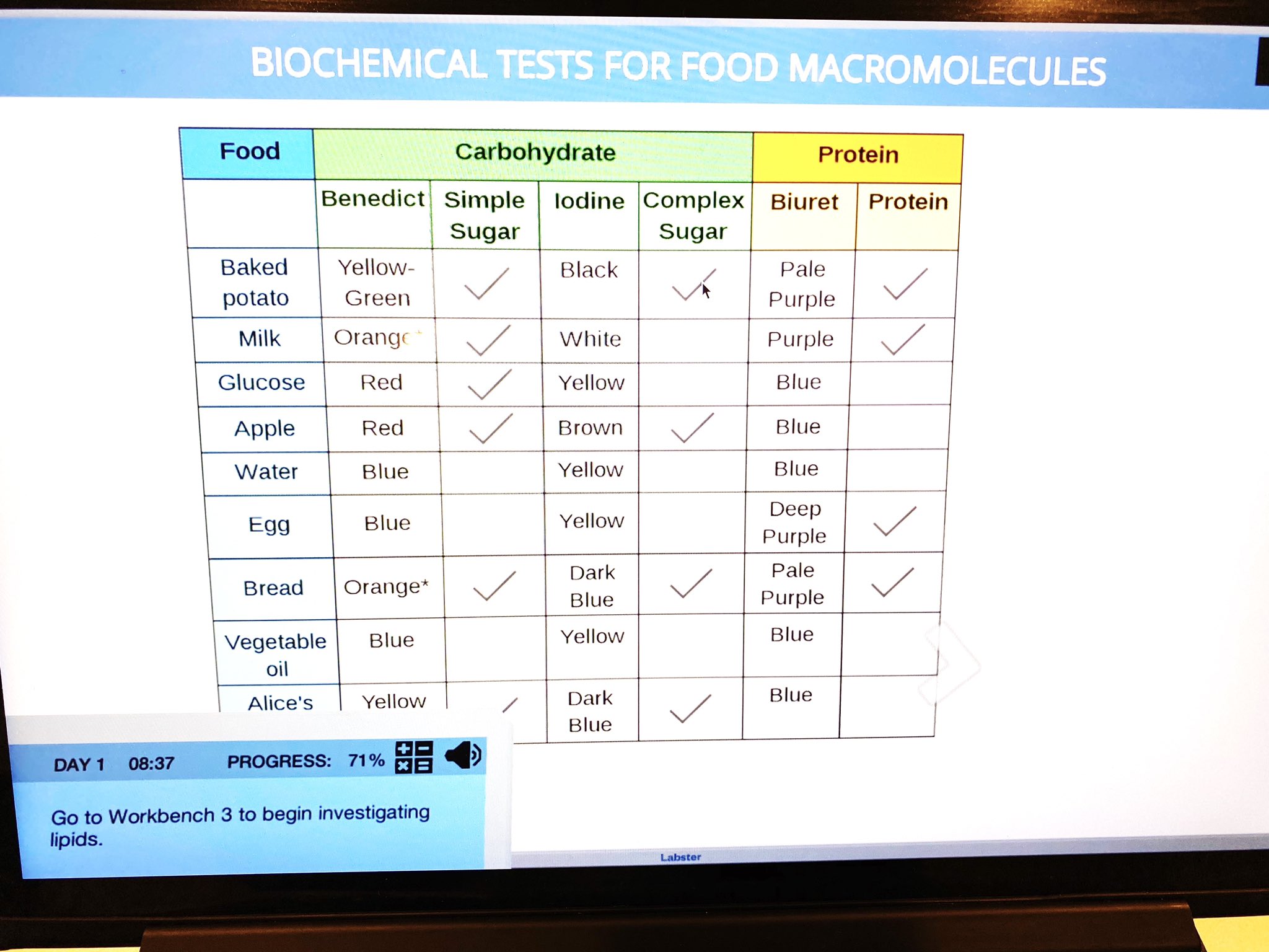 Uncover Labsters award-winning digital lab catalog with simulations in Biology Chemistry and extra. Find out about organic macromolecules. BA BIOCHEMISTRY TESTS for FOOD MACROMOLECULES Carbohydrate Benedict Easy lodine Complicated Biuret Protoin Sudan Lipid sugar potato white Orange Purple Yellow Pink Egg orange Pale Pink Darkish Yellow Blue Pink Darkish blue salad Reset Desk Examine DAY 1 0959 AM PROGRESS.