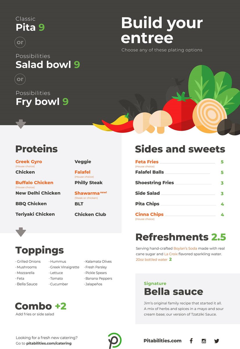 Pitabilities Menu Pitabilities Menu Serves American Greek Mediterranean. Really its greater than only a pita as Pitabilities offers you two different potentialities to customise your meal on. The right base for all our contemporary proteins and toppings.