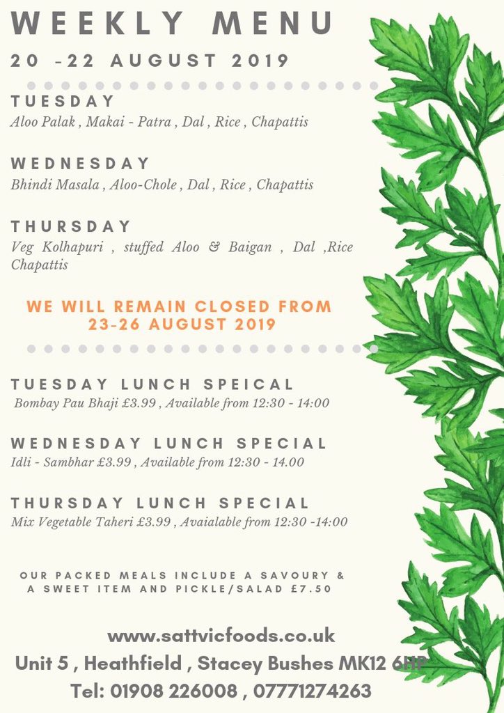 Sattvic Meals Milton Keynes. Unit 5 Heathfield Stacey Bushes Milton Keynes MK12 6HP. Tuesday 0900 – 2000 HRS.